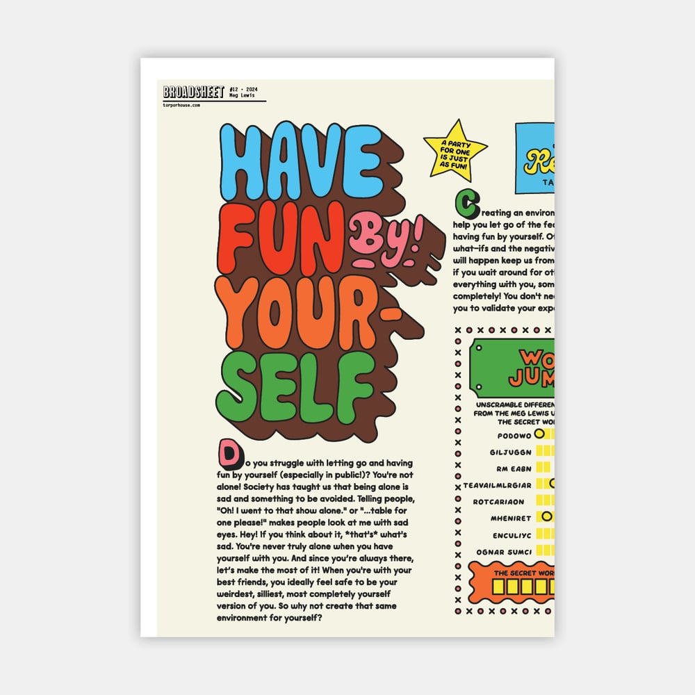 Broadsheet is a single sheet of newspaper-sized paper featuring an individual artist, who is given freedom to determine the topic and contents of the page and support to make it a reality. It is intended to sit in the space between zine-making, artwork, and exhibition space. Broadsheet is curated and designed by Andrew Rease Shaw and produced under the Torpor House imprint.