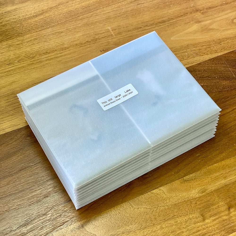 Set of 12 postcards, 5" x 7" each, enclosed in a vellum envelope.