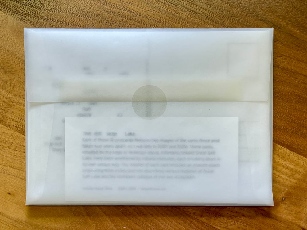 Each of these 12 postcards features two images of the same fence post taken four years apart, on Leap Day in 2020 and 2024. These posts, situated on the edge of Antelope Island, extending toward Great Salt Lake, have been weathered by natural elements, each breaking down in its own unique way. The reverse of each card includes an erasure poem originating from online sources describing various features of Great Salt Lake and the imminent collapse of this key ecosystem.